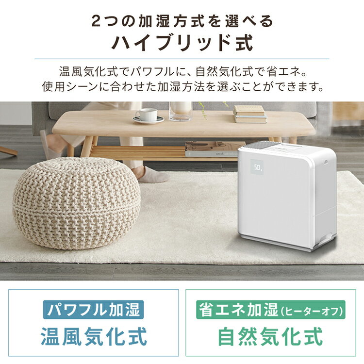 ■商品サイズ(cm)幅約37.5×奥行約20.8×高さ約37.6■質量約5.4kg■電源コードの長さ(m)約1.5■電源AC100V(50/60Hz)■消費電力319/325W■適用床面積(木造和室/プレハブ洋室)12畳/19畳■加湿量約700mL/h■連続加湿時間約7.1時間静かにやさしく潤うハイブリッド式加湿器。