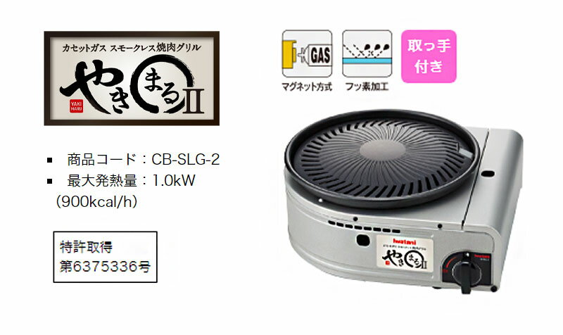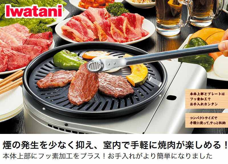 おうちで手軽に焼肉屋さん気分を!生産国:日本商品サイズ:幅303×奥行278×高149 mm商品重量:約2.0kgカラー:シルバー&ブラック最大発熱量:1.0kW(900kcal/h)連続燃焼時間:約217 分点火方式:圧電点火方式容器脱着方式:マグネット方式安全装置:圧力感知安全装置 他使用ガス:イワタニカセットガス材質:本体/鋼板、プレート/アルミダイカスト(プレート外径:233mm)、水皿/鋼板、バーナー/耐熱アルミダイカスト、点火つまみ/ABS 樹脂【送料について】沖縄、離島は別途送料を頂きます。